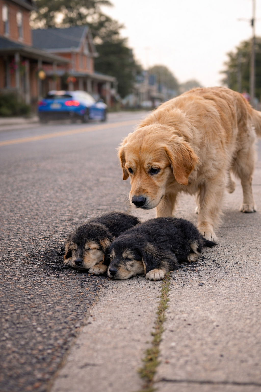 Near the curb, two small golden retriever puppies were resting peacefully beside the road. They were young, innocent, and completely unaware of the world’s dangers.