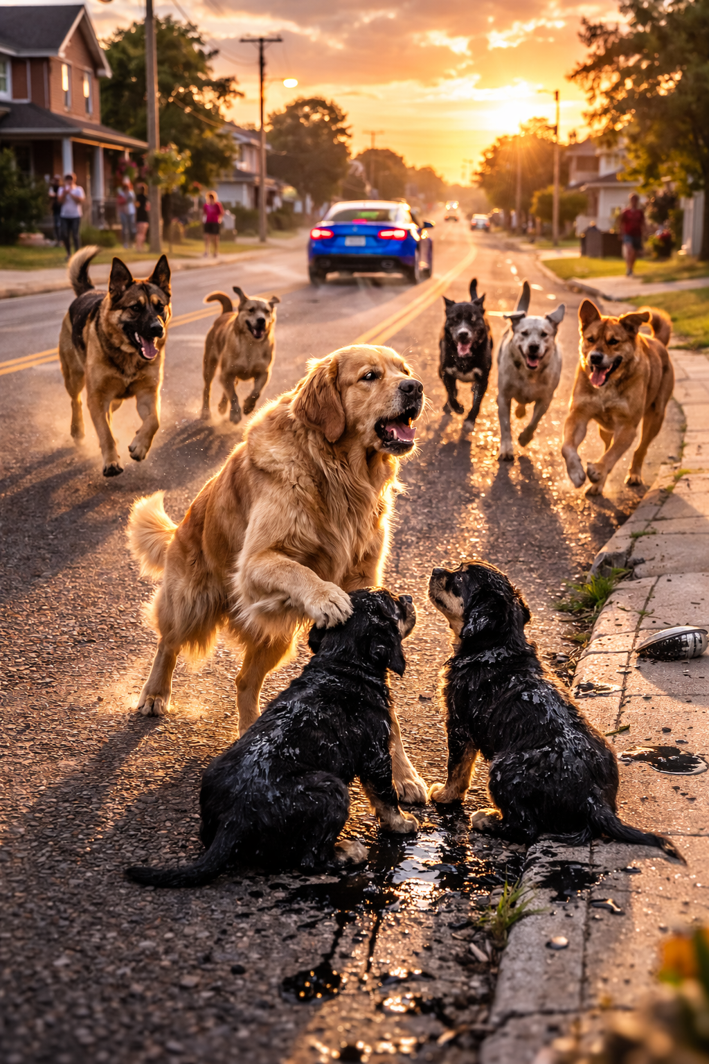 The mother dog stood protectively beside them and stared down the street where the blue car had disappeared.