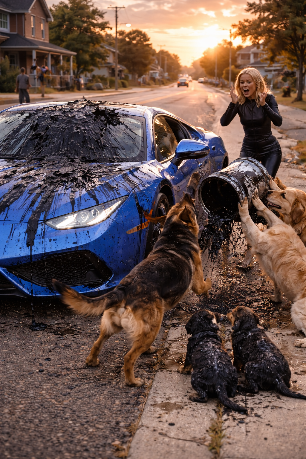 Dark stains appeared on their golden fur while the woman laughed and drove away down the street.