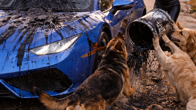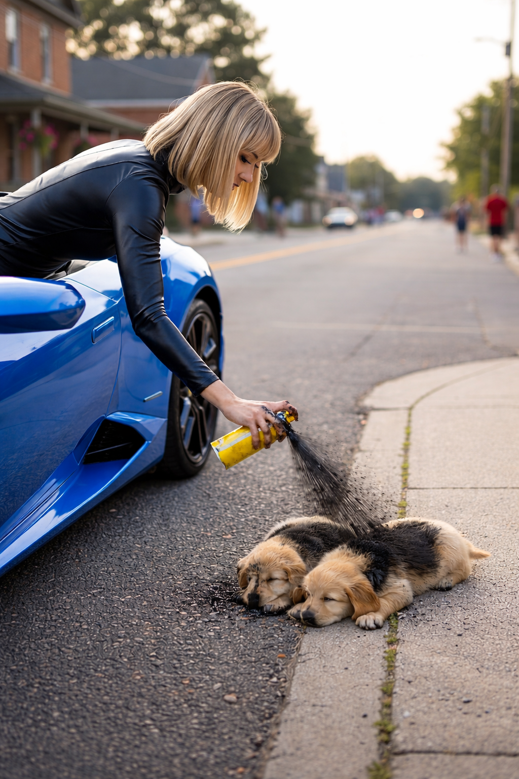Dark stains appeared on their golden fur while the woman laughed and drove away down the street.
