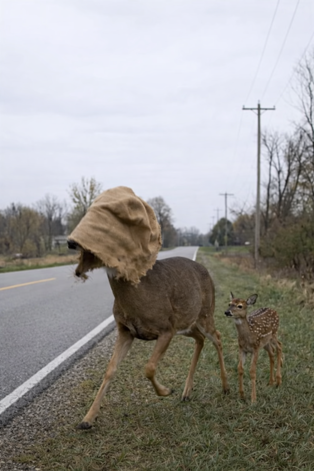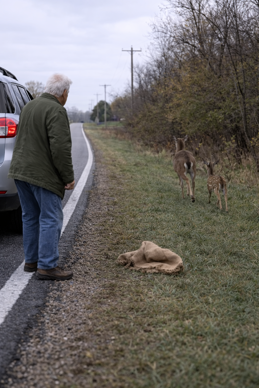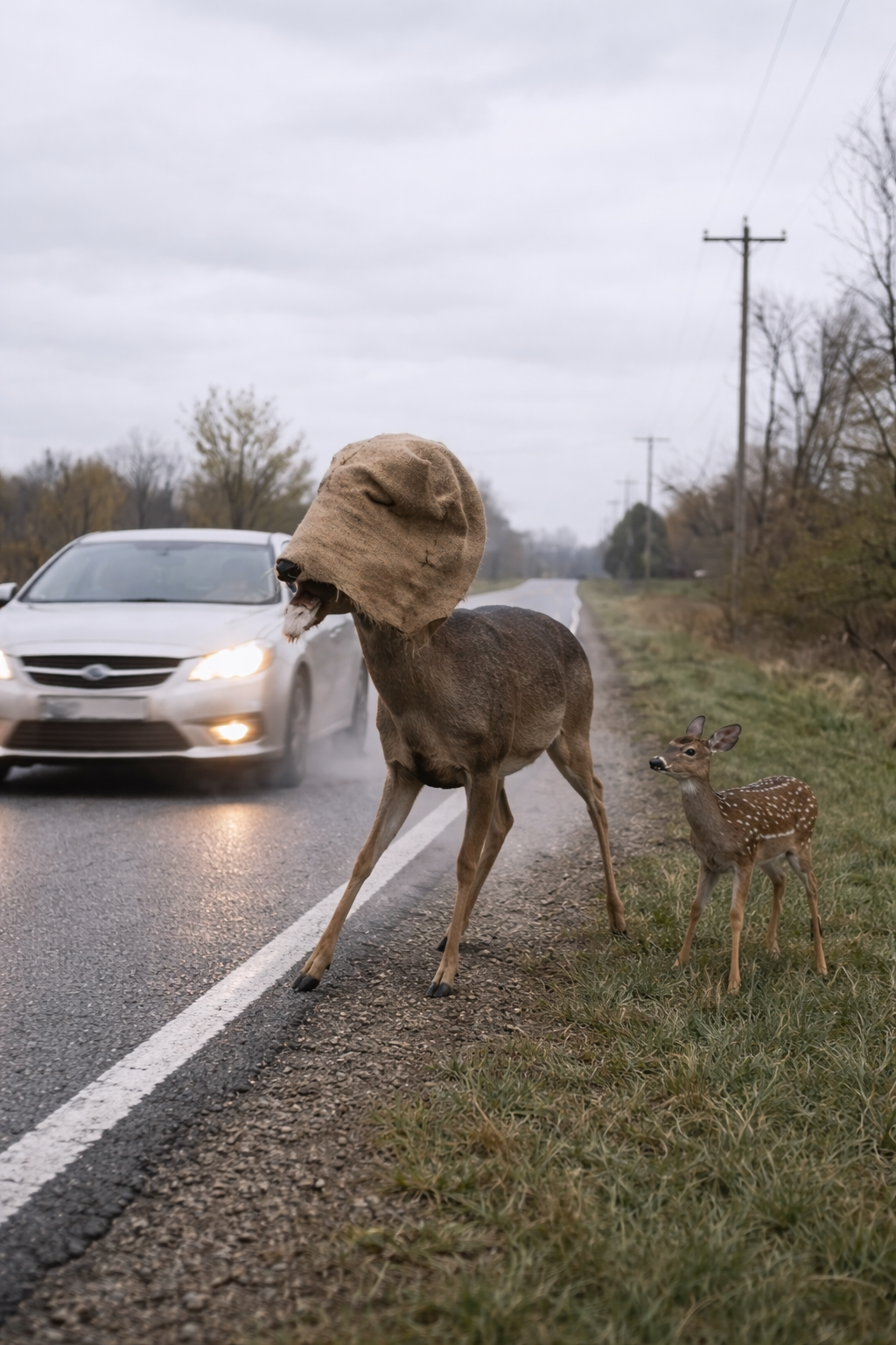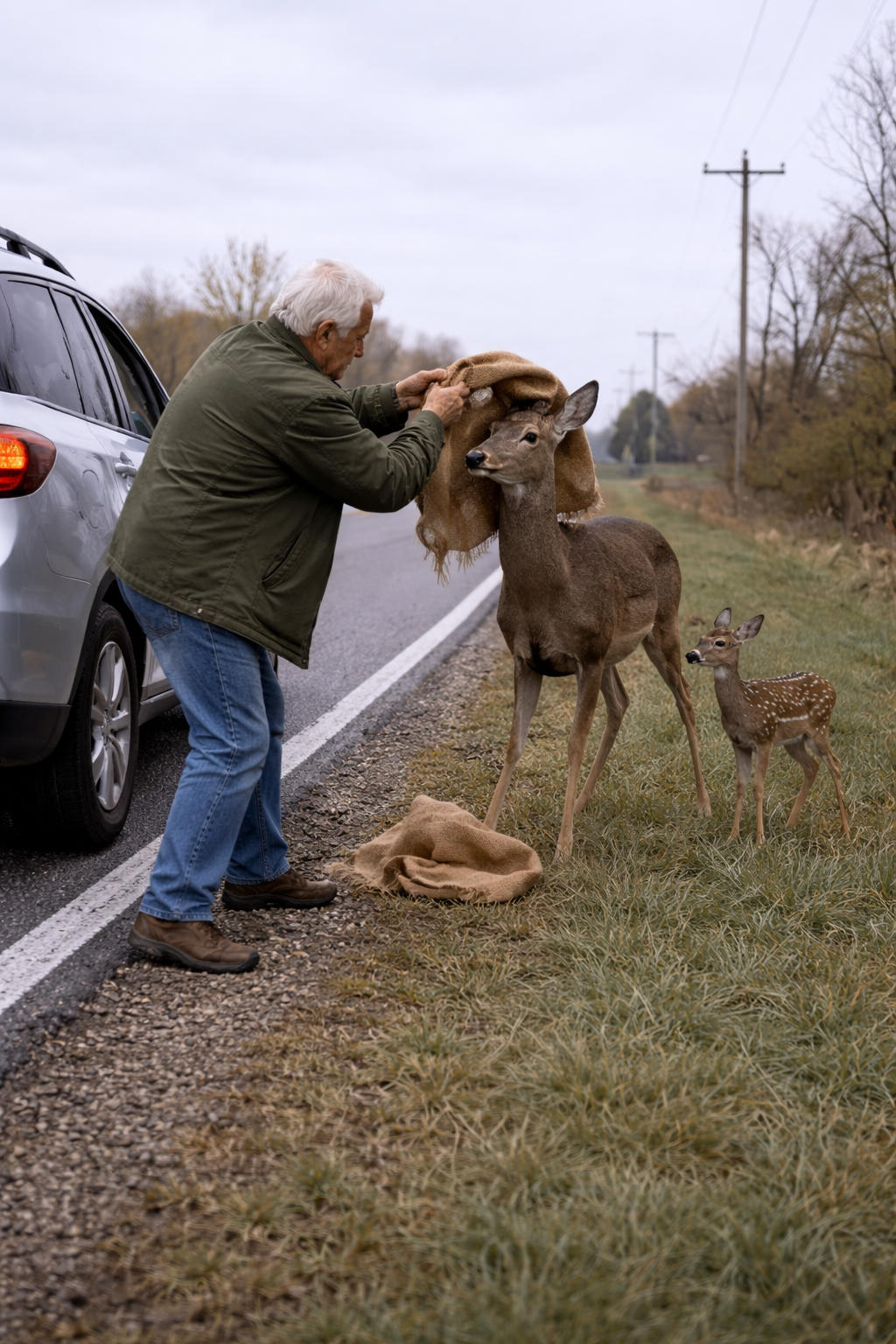 On the roadside, the small fawn watched helplessly.