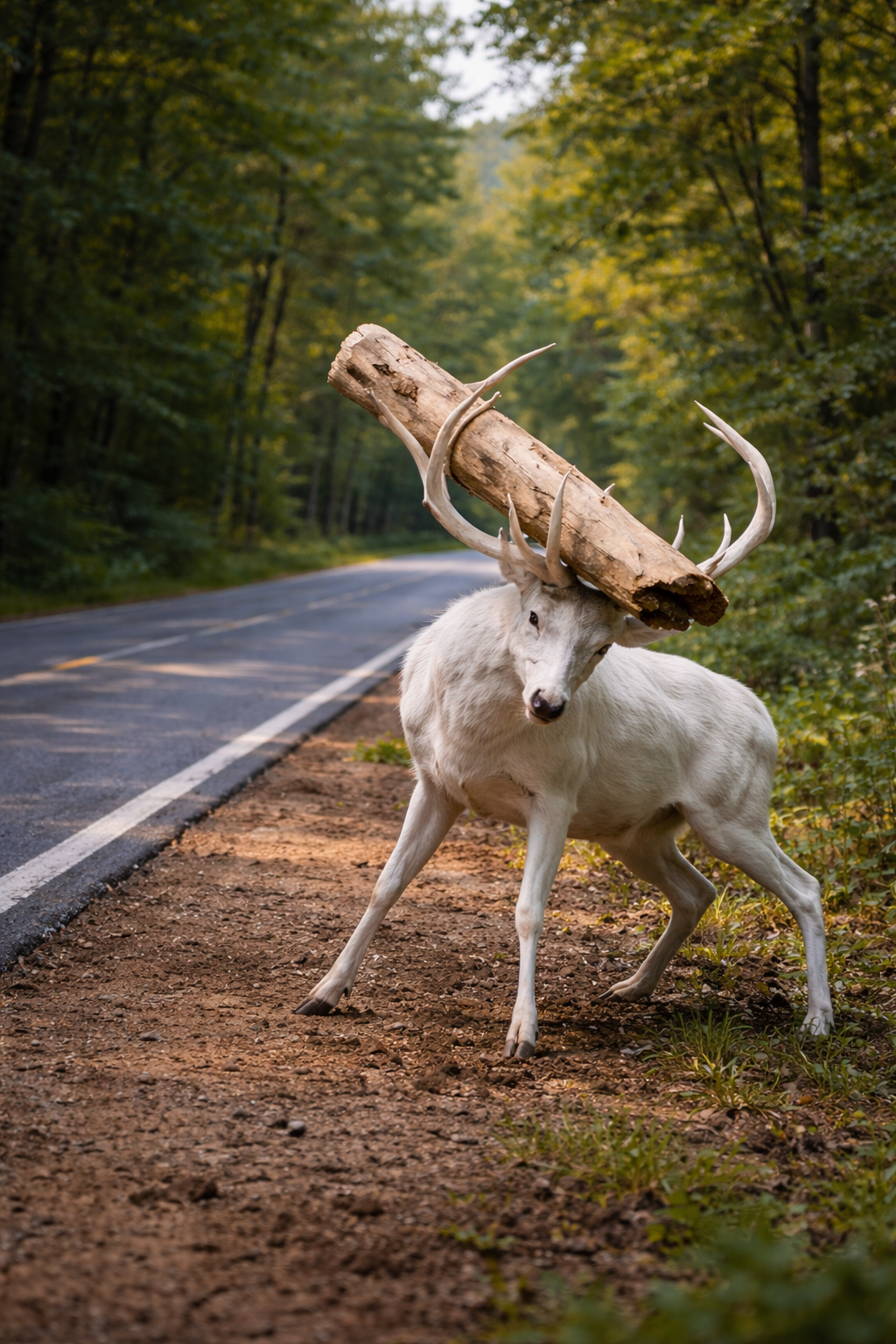 Between its large antlers was a heavy wooden log.