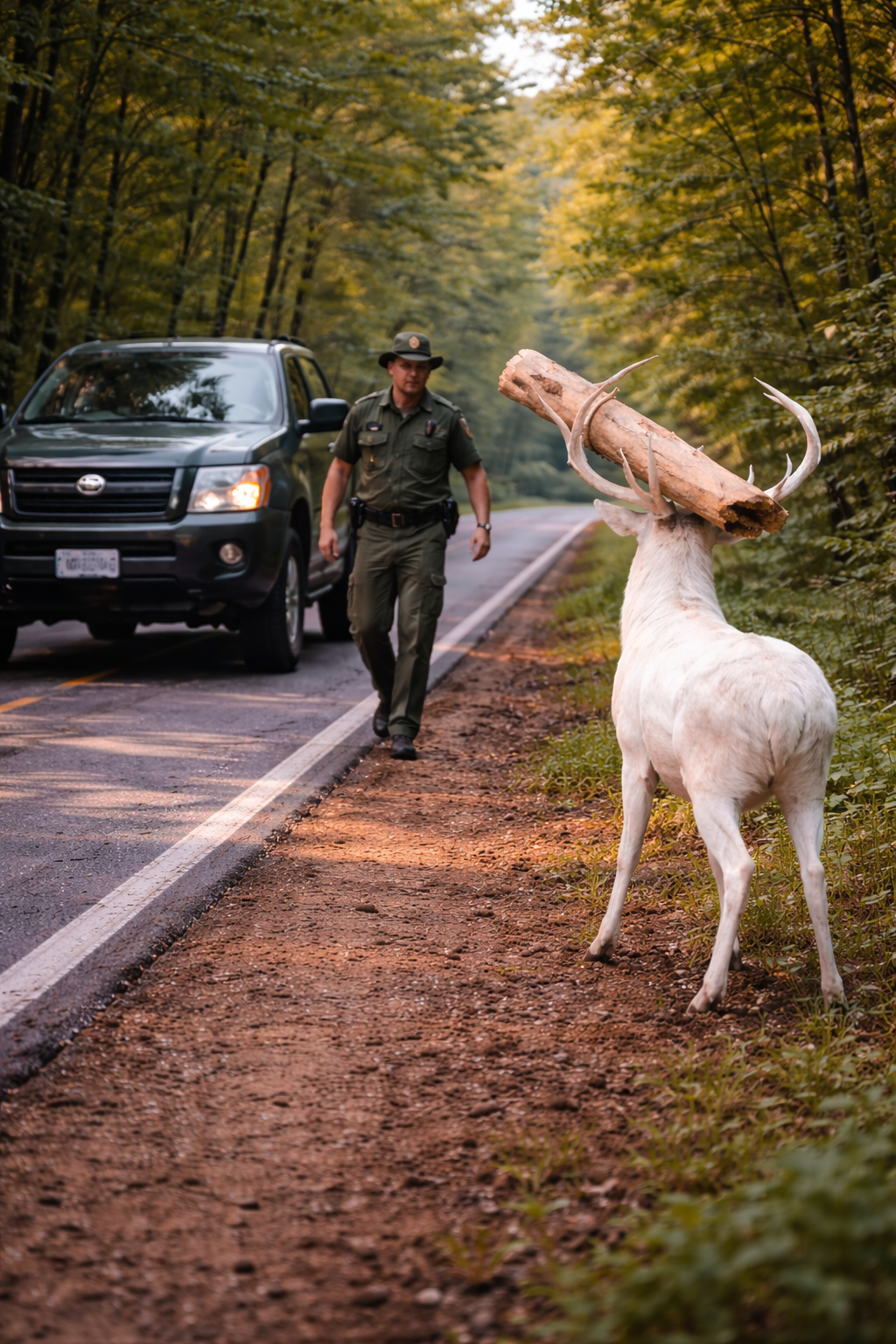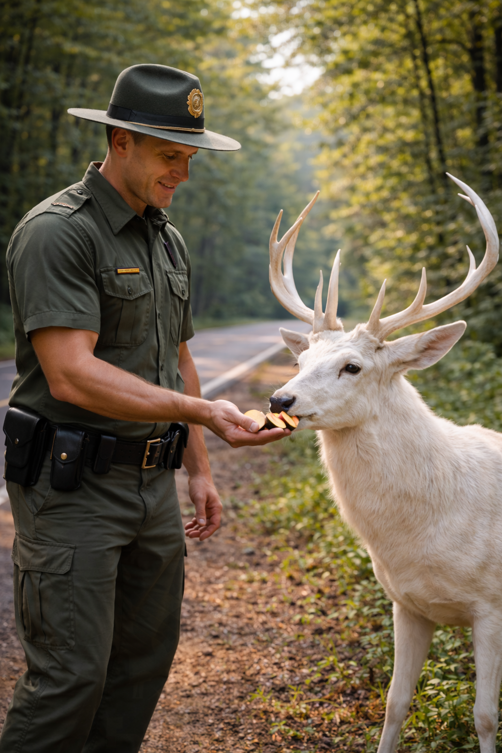 The deer remained standing beside the ranger for a moment.