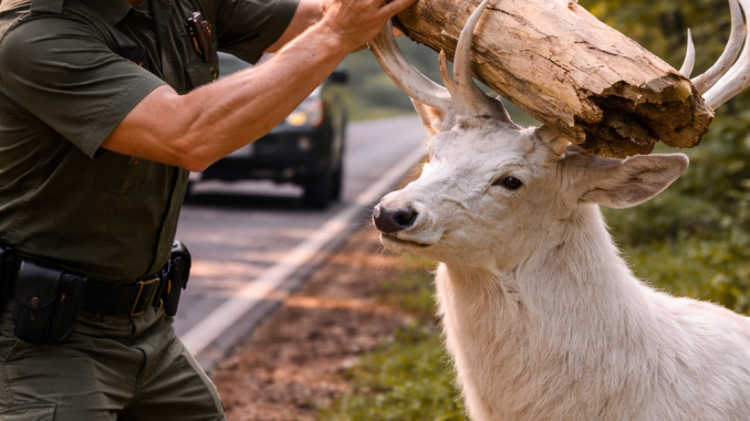 The ranger approached slowly, speaking softly to keep the deer calm.