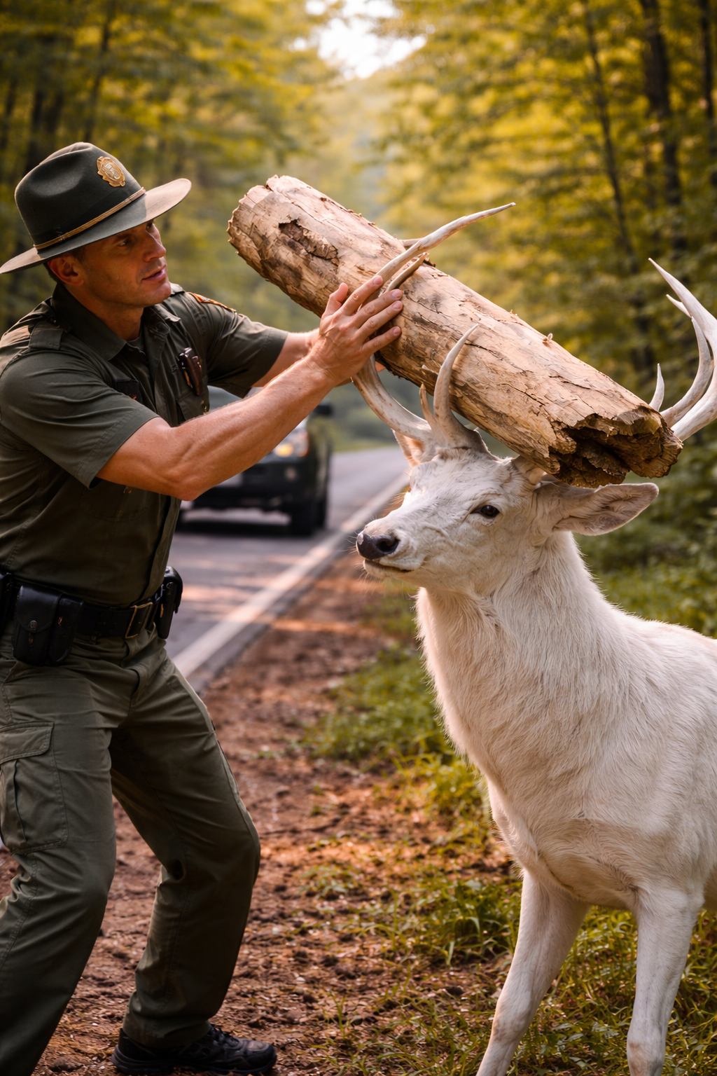 He carefully reached toward the wooden log trapped between the antlers.