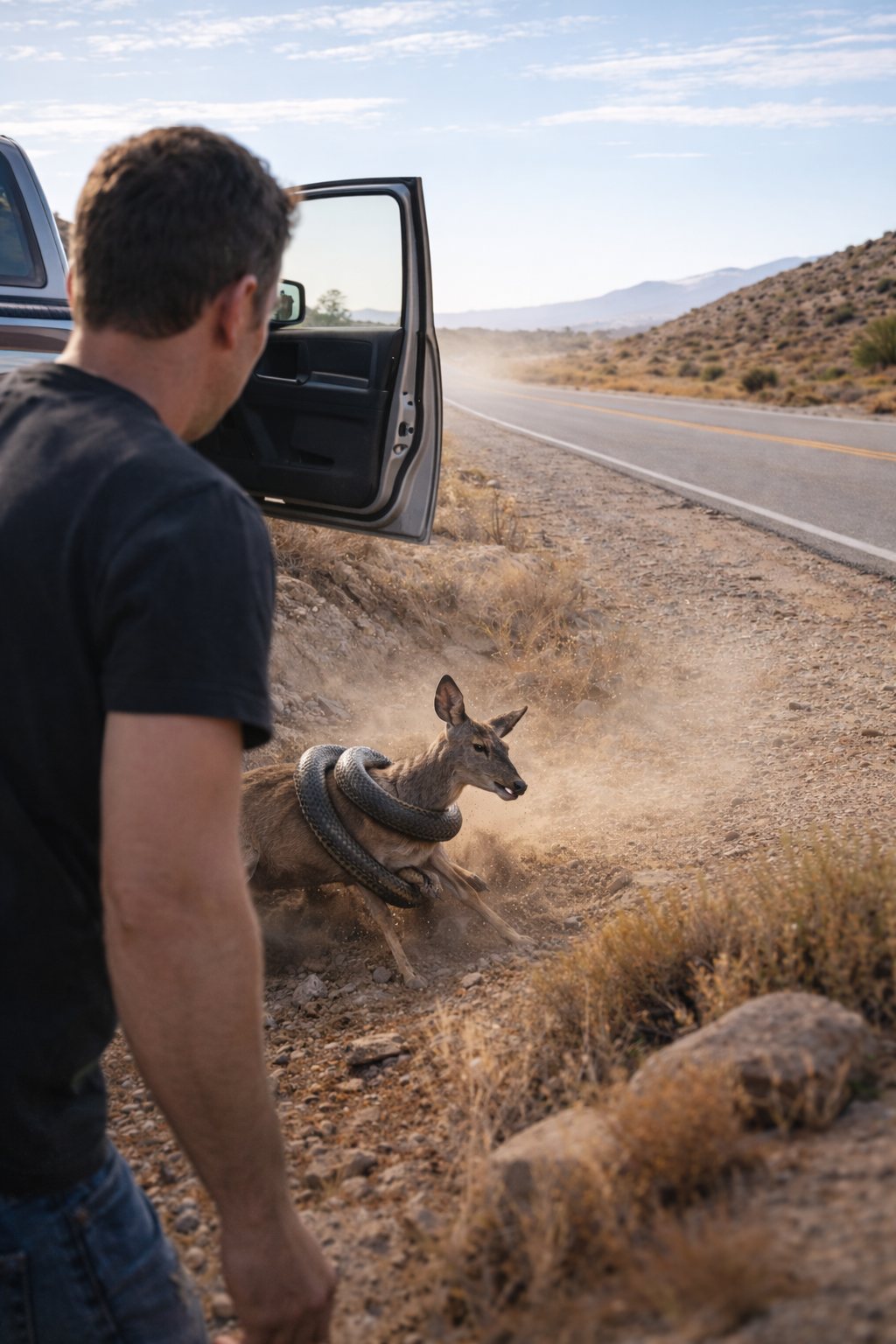 The driver noticed movement near the roadside. It wasn’t clear at first, just something out of place against the still landscape. But as the truck got closer, the situation became visible.