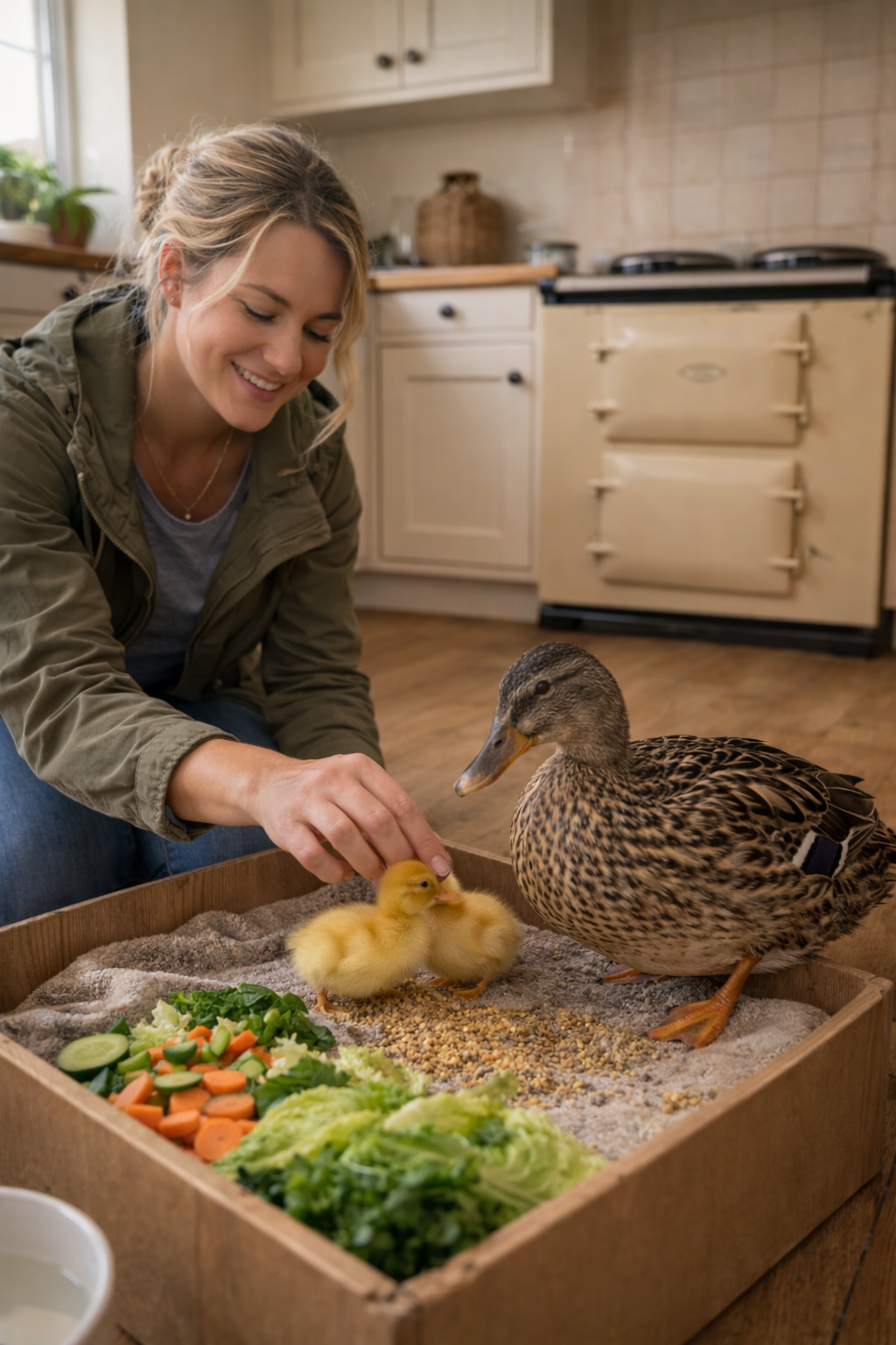 Later that afternoon, the duck family rested inside a warm farmhouse kitchen.