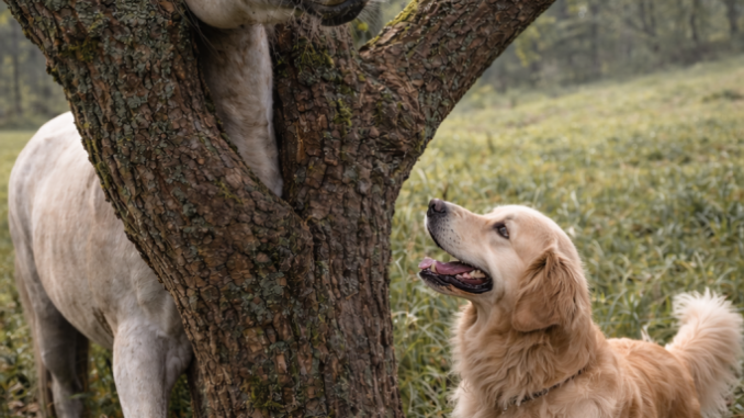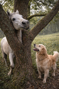 The dog approached slowly, alert and focused. It sensed something was wrong. It circled the horse, studying the branches, watching the animal’s eyes.