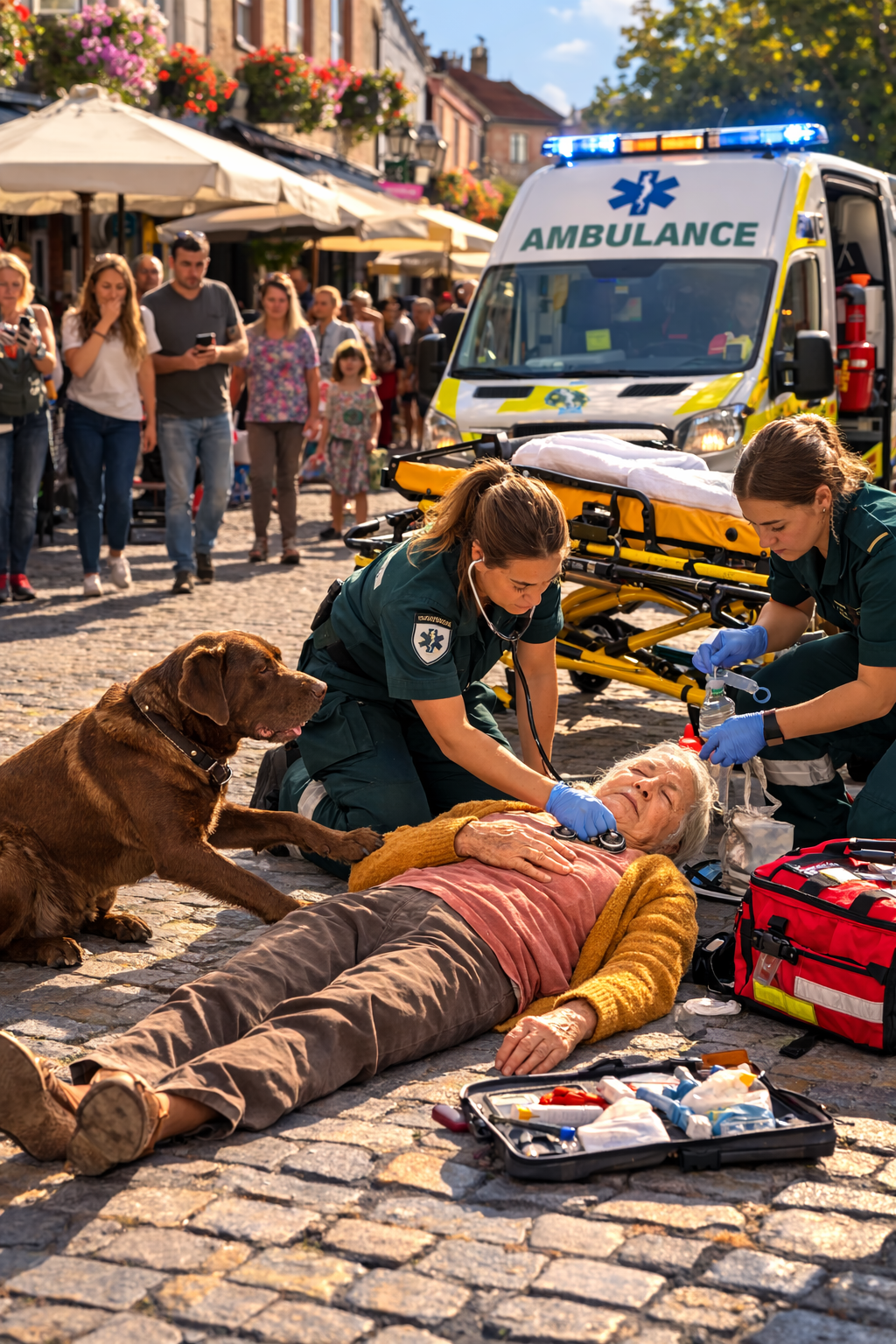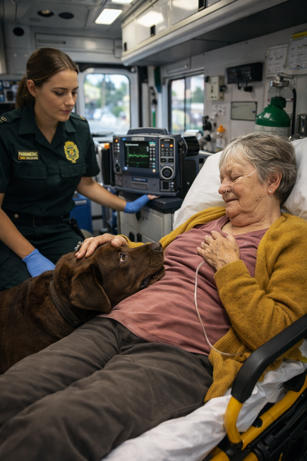 Inside the vehicle, the elderly woman lay on the stretcher while paramedics monitored her condition.