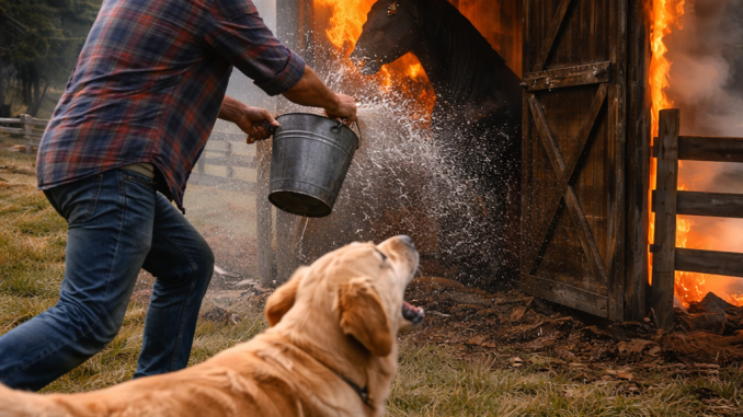 At first, it was only smoke rising quietly into the sky. Inside, a horse stood trapped behind a wooden door, unaware that danger was already growing around him.