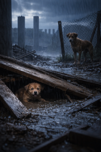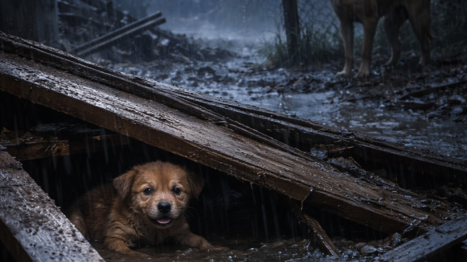 On a stormy evening at an abandoned construction site, a small brown puppy became trapped beneath fallen wooden boards as heavy rain flooded the area.