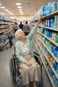 In one of the hygiene aisles, an elderly woman sat quietly in her wheelchair. Her short gray hair framed a tired but dignified face. She wore a light cardigan and held a small folded shopping list in her hand.