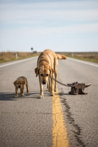 In the middle of an empty rural highway, a large dog struggled to move forward. A heavy metal object dragged behind him, slowing every step. Beside him walked a small puppy, staying close, as if refusing to leave.
