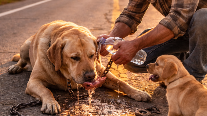 Back on the road, he found the exhausted dog lying motionless. Without hesitation, he knelt down, carefully assessing the situation. He offered water first, pouring it slowly into his hand. The dog responded, weak but aware.