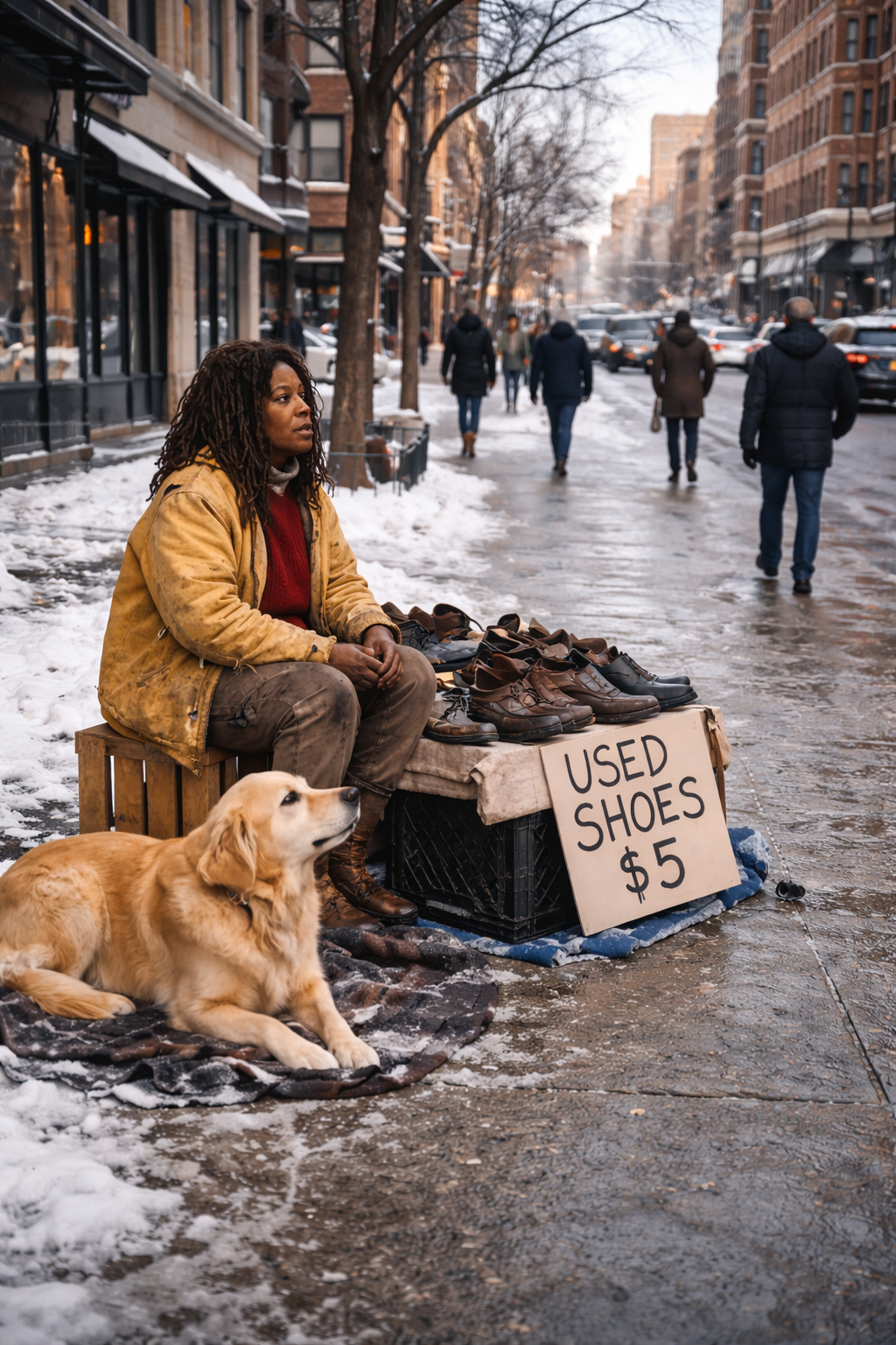 She had been sitting there for hours, hoping someone might stop and buy a pair of shoes.
