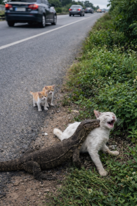 Near the grass shoulder, a white mother cat was in distress. Two small kittens stood nearby, confused and frightened. Passing vehicles continued without slowing down. The situation could have easily gone unnoticed.