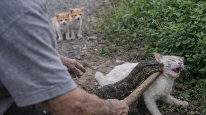 Calm and steady, he approached the animals. Using a long stick to keep a safe distance, he intervened and helped separate the threat from the cat without causing further harm. The kittens backed away at first but soon realized help had arrived.