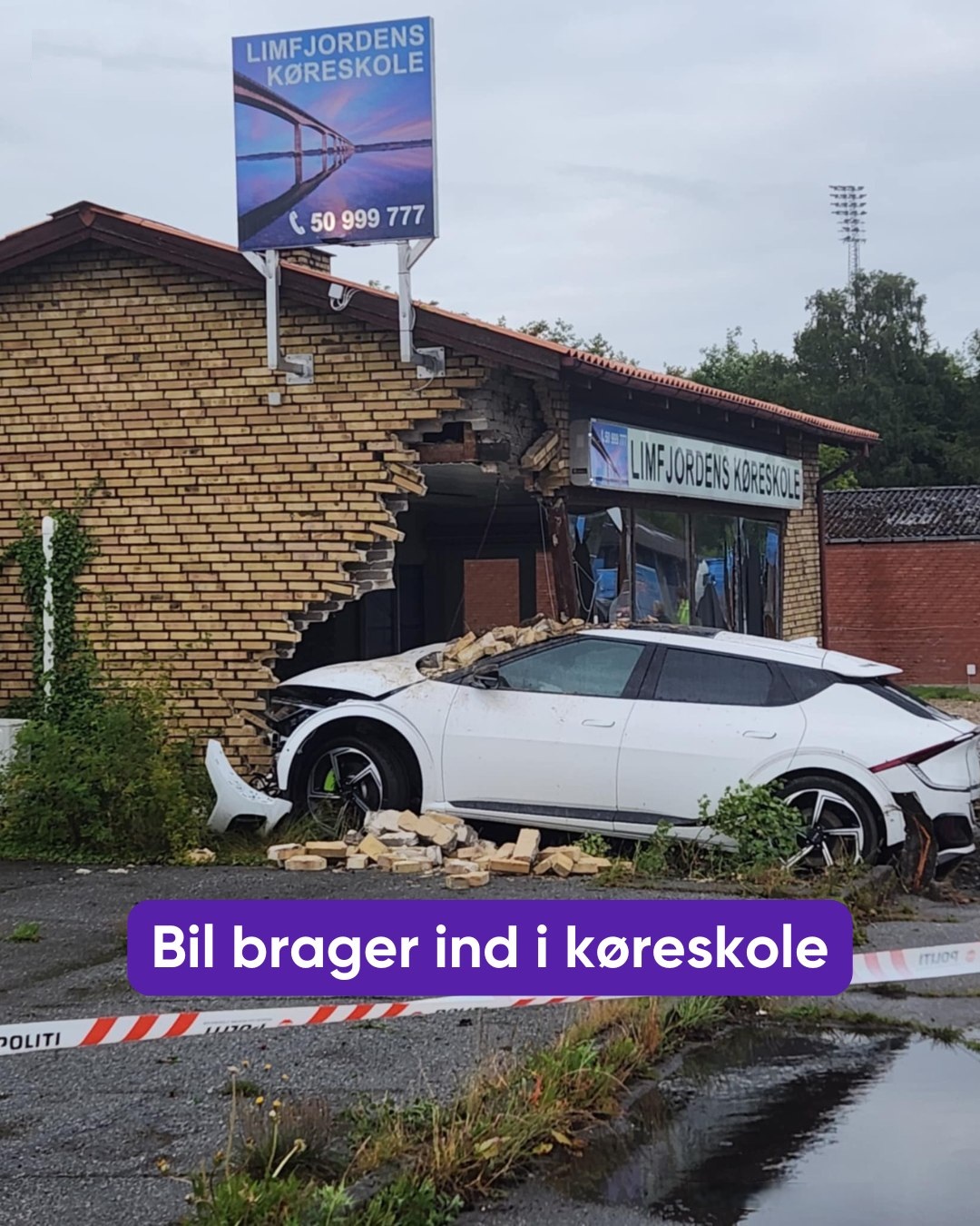 Hon berättar att hon kontaktades av polisen i Mitt- och Västra Jylland senare under eftermiddagen. De informerade henne om att en vit elbil frontalkrockat med byggnaden där körskolan är belägen.