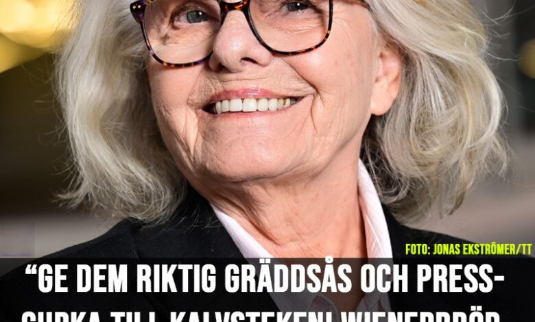 ”Ge dem riktig gräddsås och pressgurka till kalvsteken! Wienerbröd till kaffet och ett glas rödvin om de vill ha det. Det är en grymhet att ständigt snåla in på de äldre,” säger hon i en intervju.
