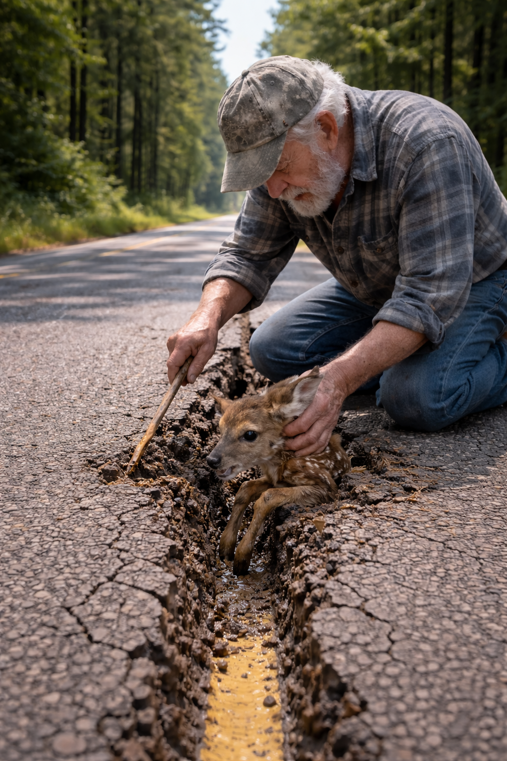 A small baby deer was trapped deep inside a broken crack in the dirt road.