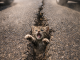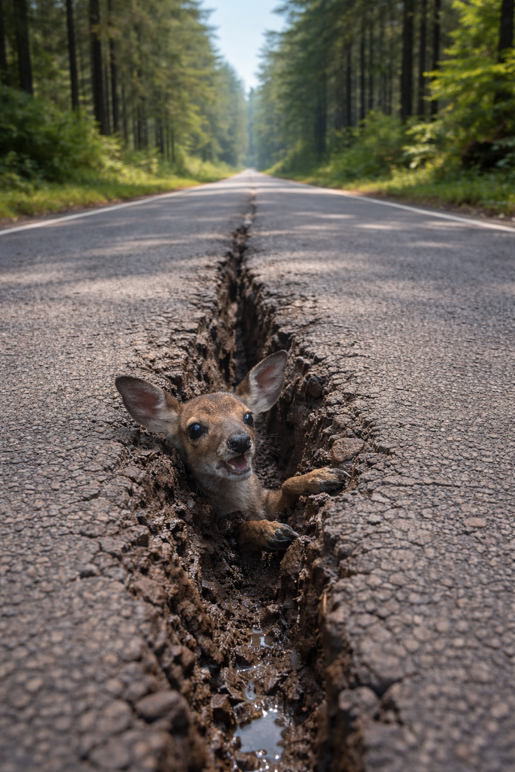 A small baby deer was trapped deep inside a broken crack in the dirt road.