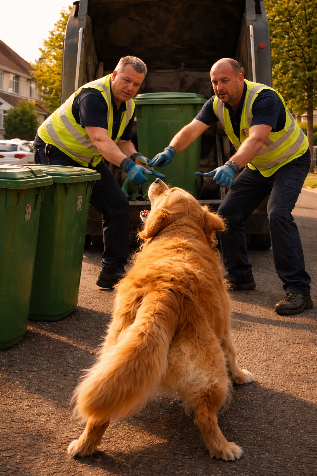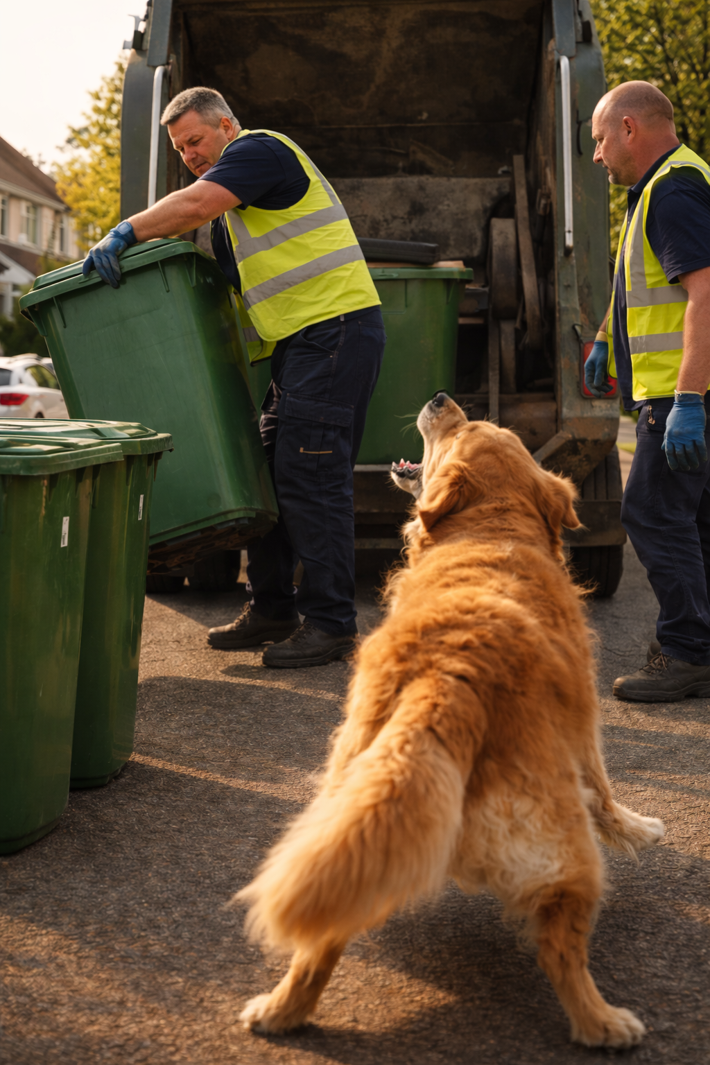 It jumped forward, barking sharply, trying to stop the movement. Its reaction was quick and focused, clearly aimed at preventing the bin from being lifted.