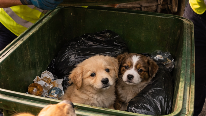 Inside, between the bags, two small puppies were curled tightly together. They were quiet, almost hidden, their small bodies pressed close as if trying to stay safe.