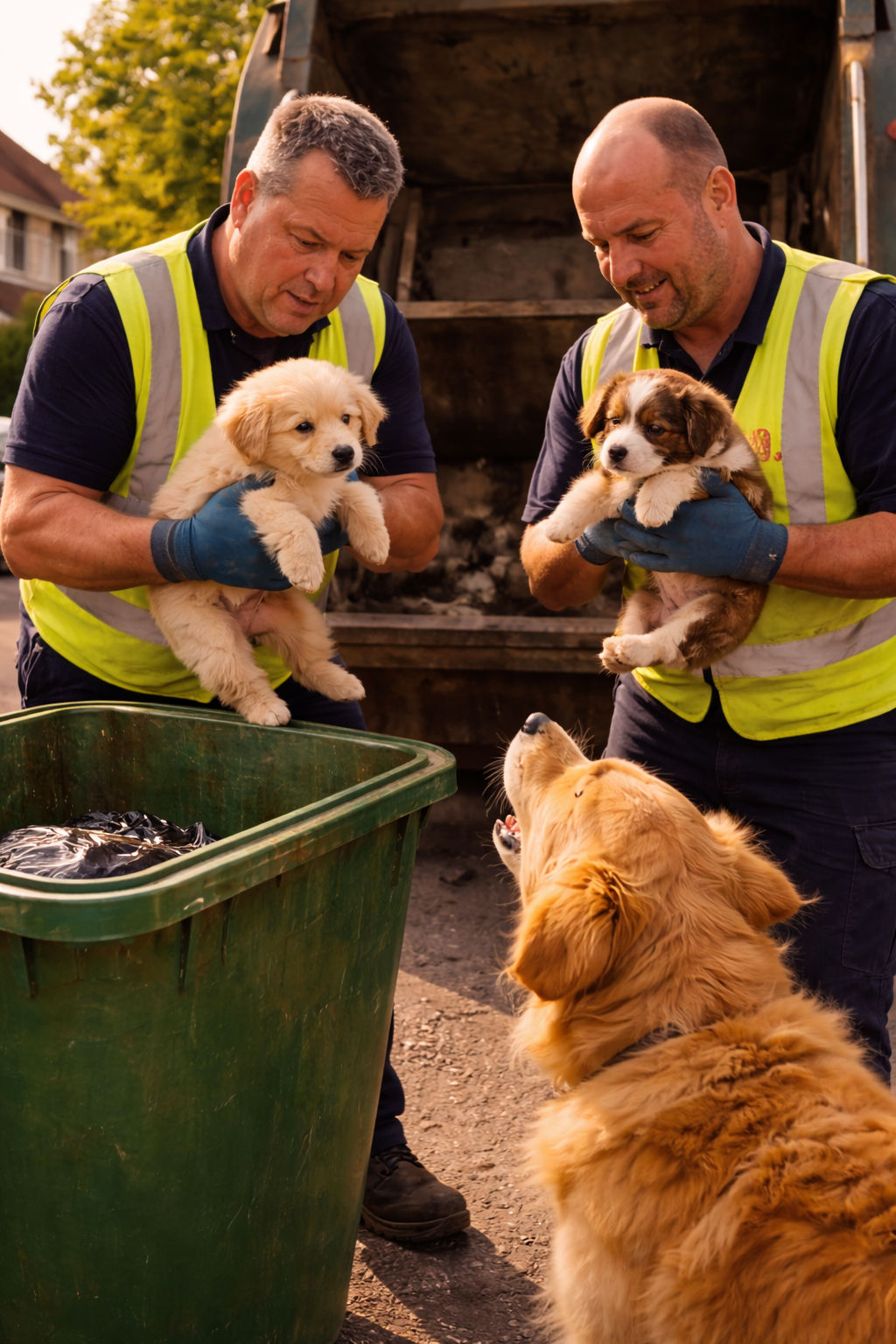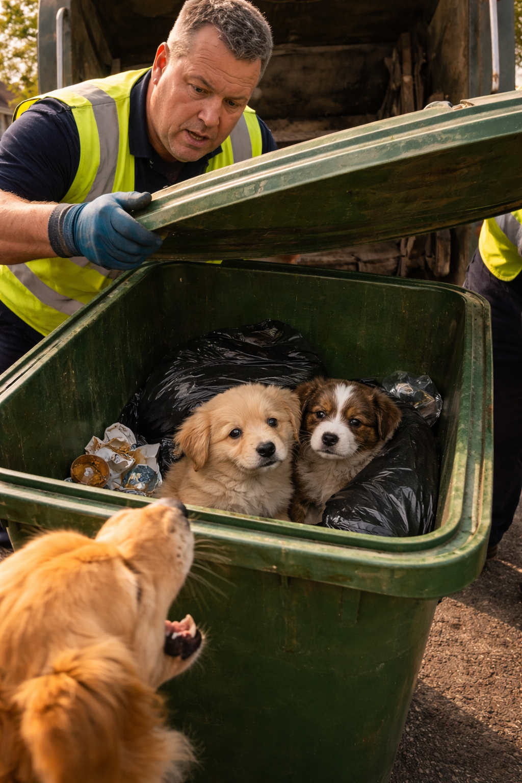 One of the workers stepped back from the truck and looked toward the bin again. The dog returned to stand beside it, watching closely, its energy still focused but no longer chaotic.