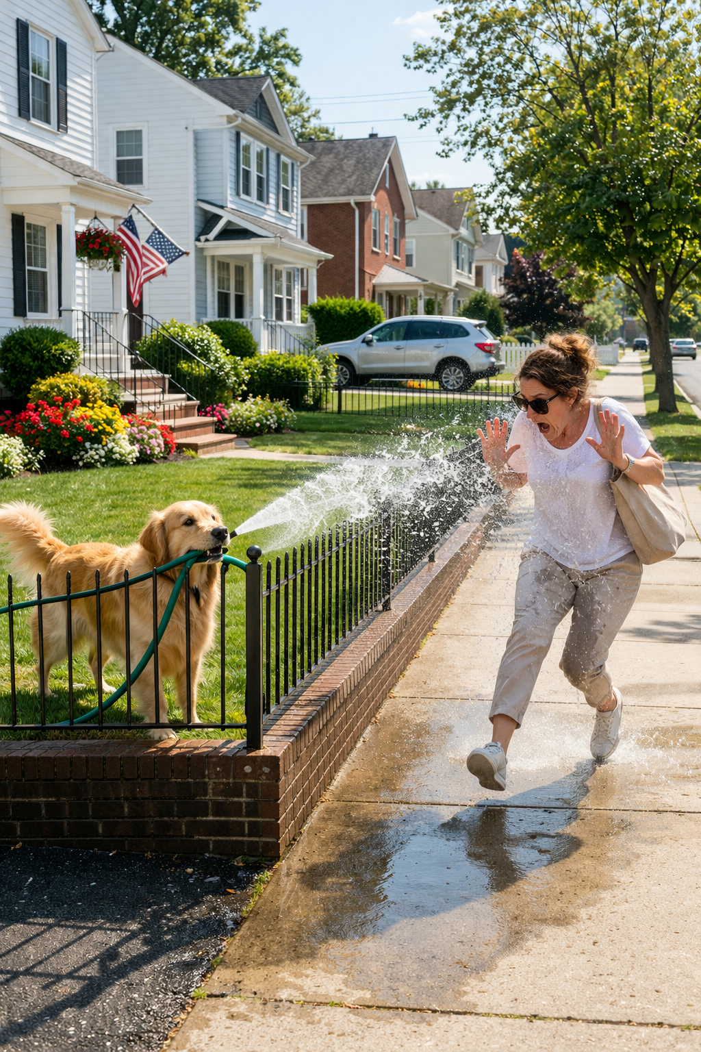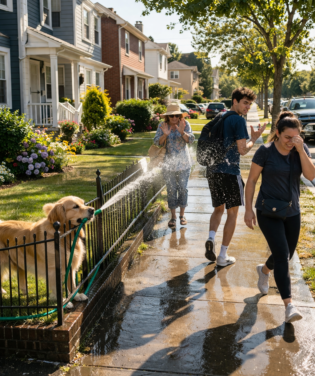 A golden retriever stood behind a low fence, holding a green garden hose in its mouth. Water sprayed continuously onto the sidewalk.