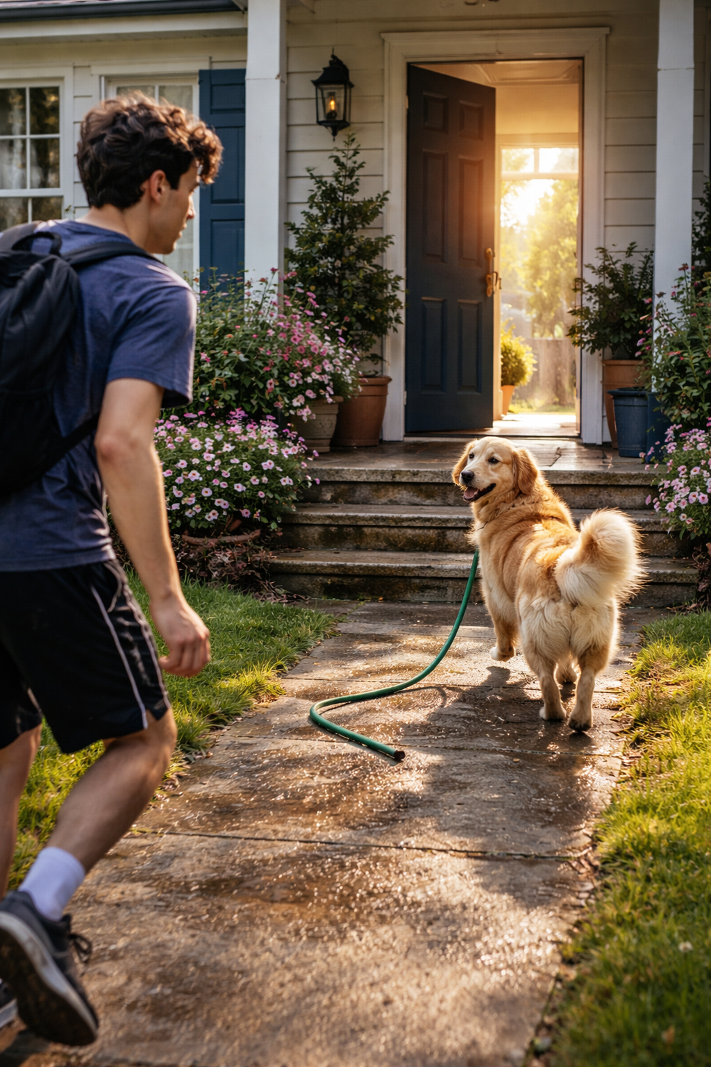 The dog stood beside him, no longer spraying water, no longer confused — just waiting.