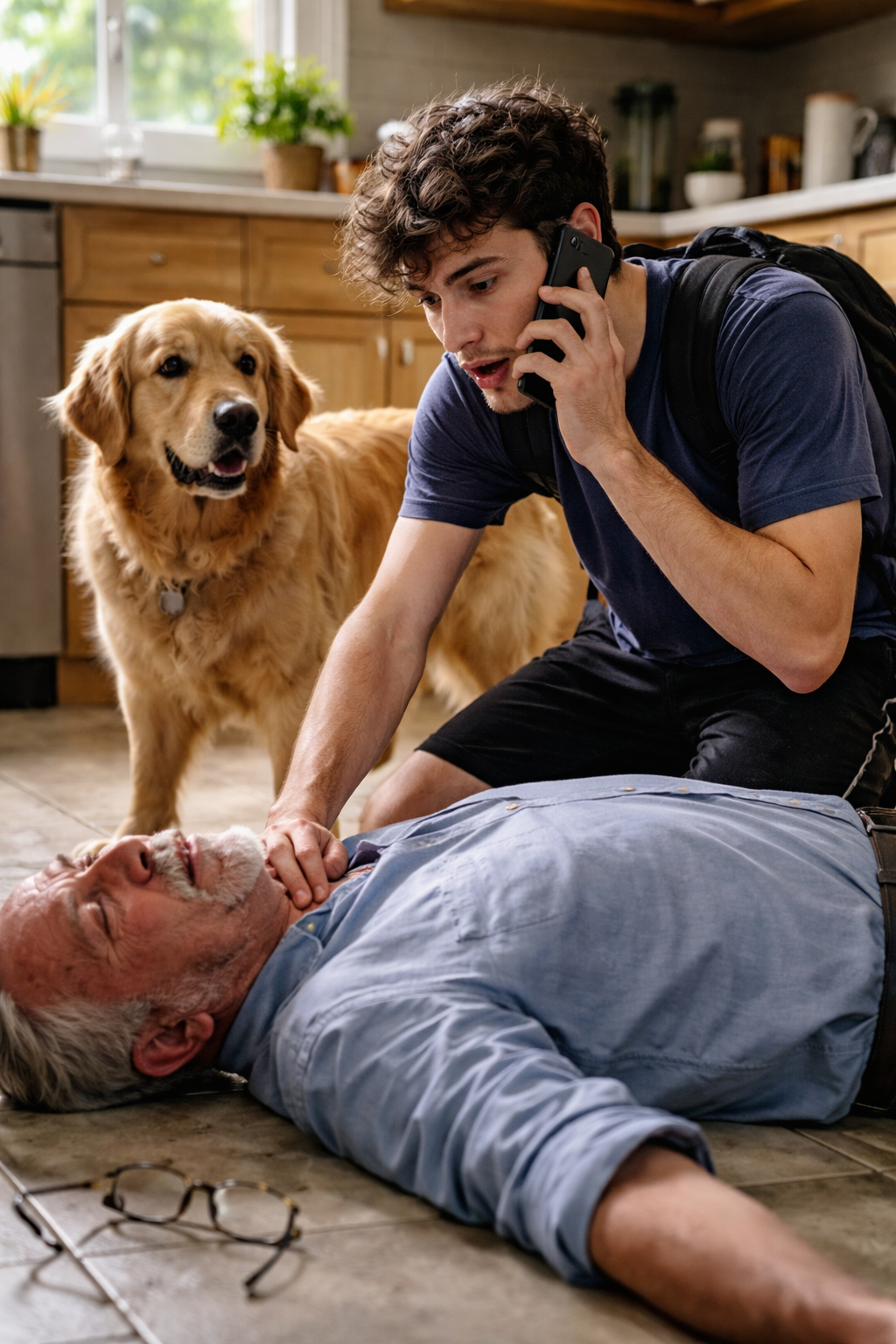 On the kitchen floor lay an elderly man.