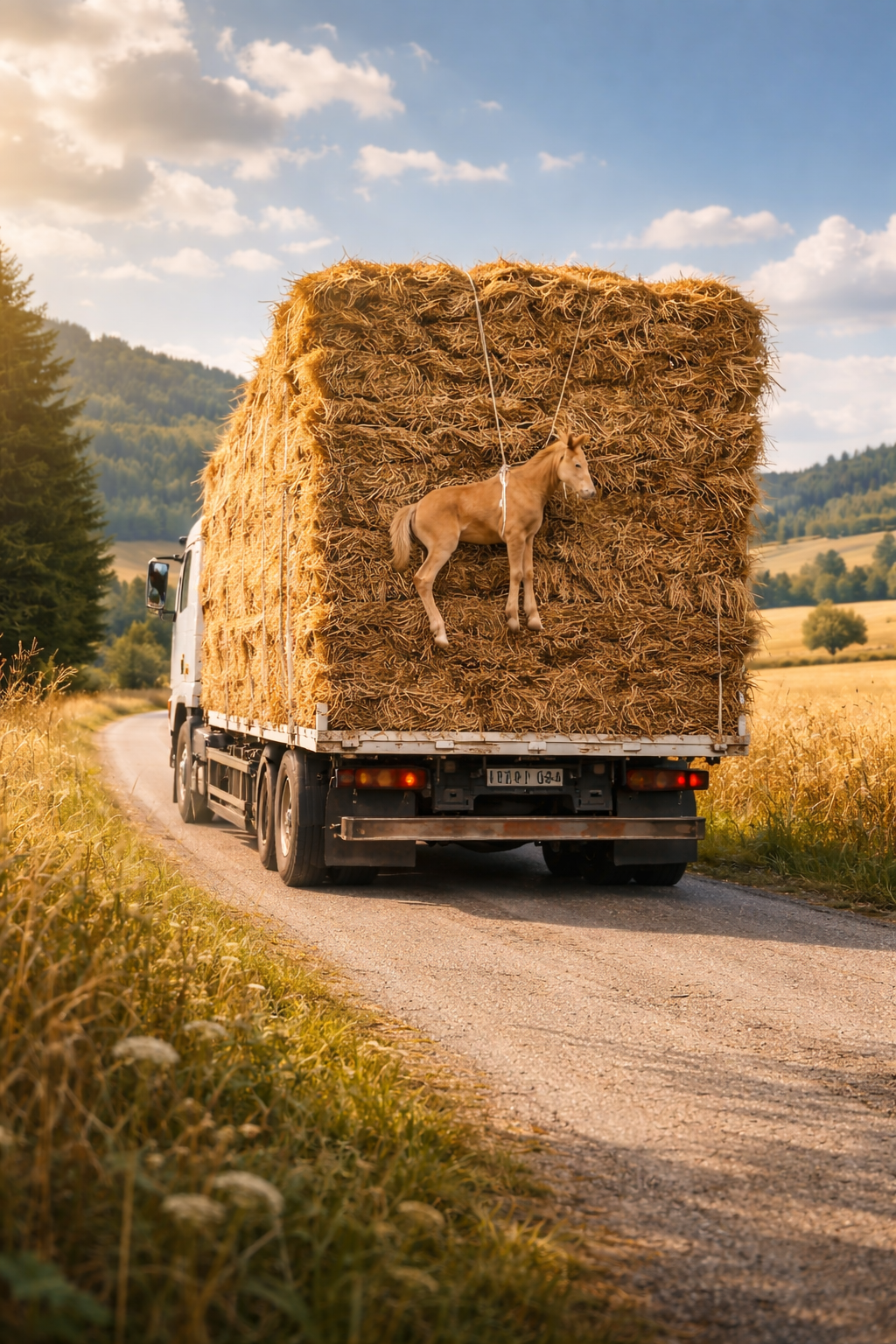 Its body was stuck between the ropes and the heavy hay as the truck continued driving down the road.