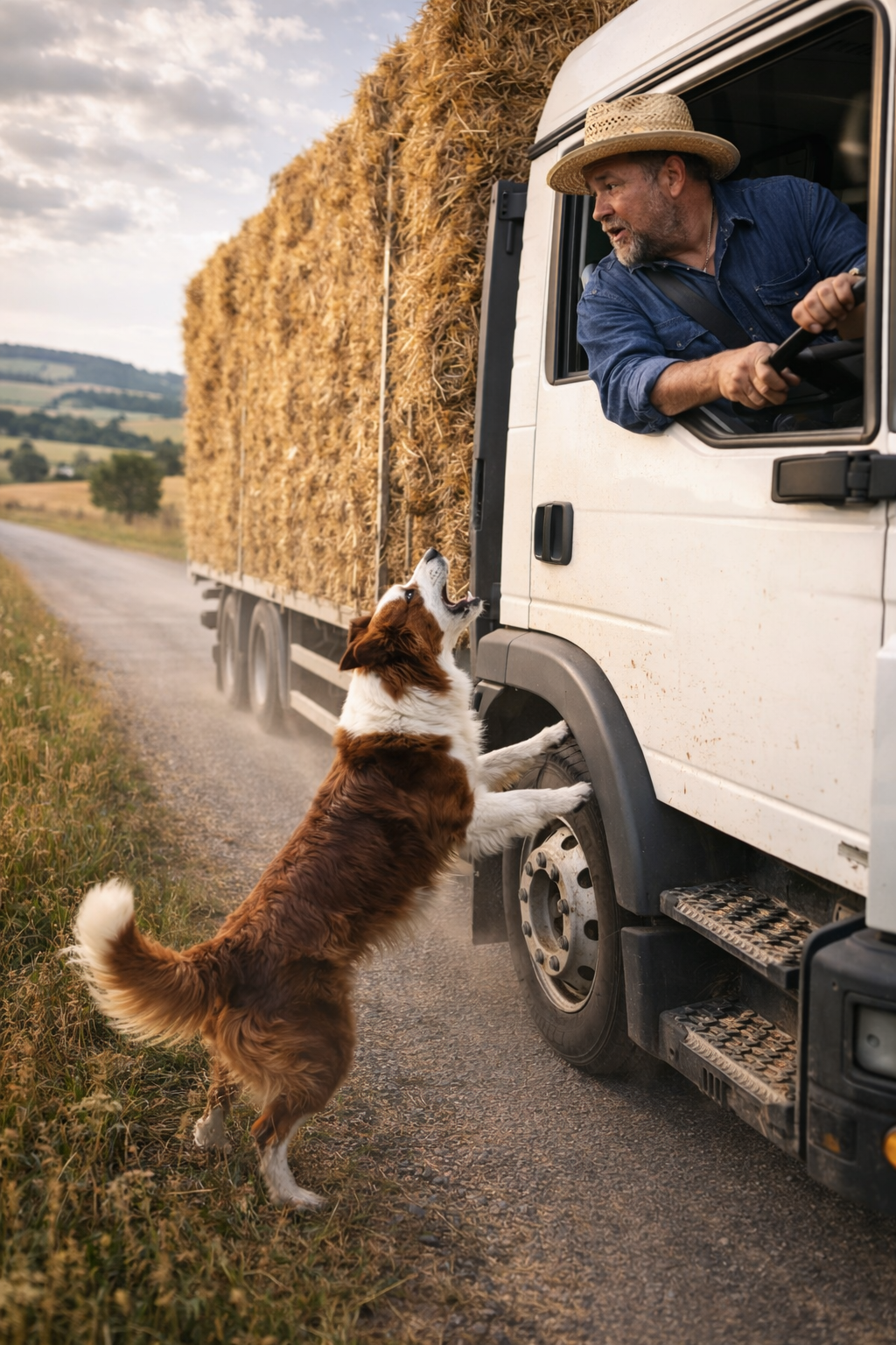 Along the road, a large farm truck moved steadily forward.