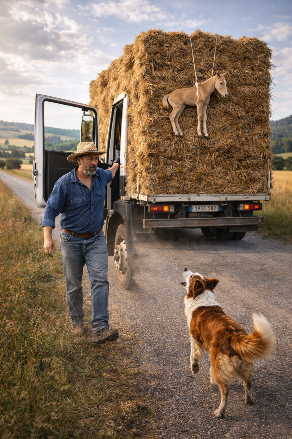 Inside the truck cab sat a middle-aged farmer wearing a straw hat.