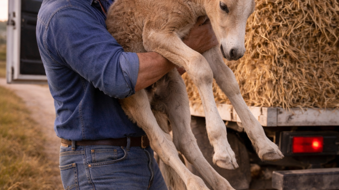 The farmer gently helped guide the foal safely to the ground.