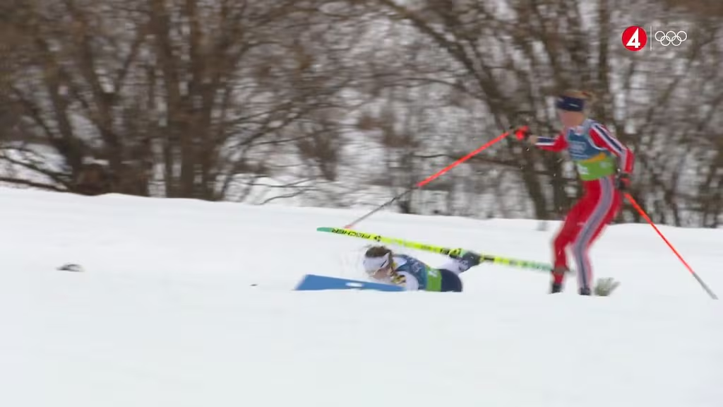 Ebba Andersson fastnade med skidan i snön – och föll.