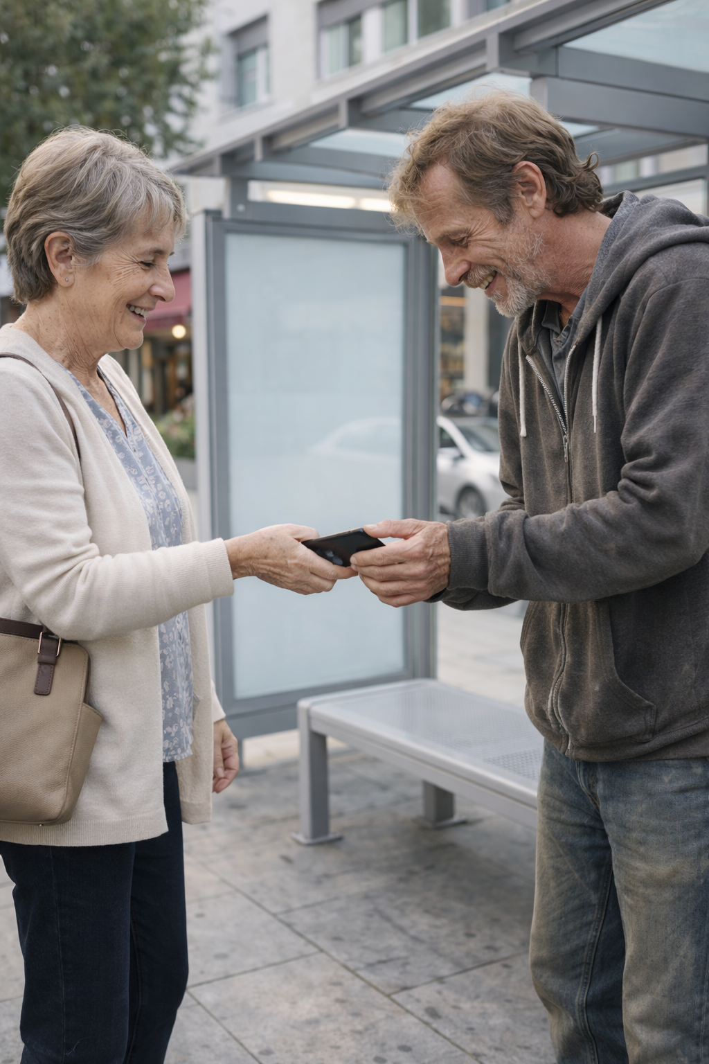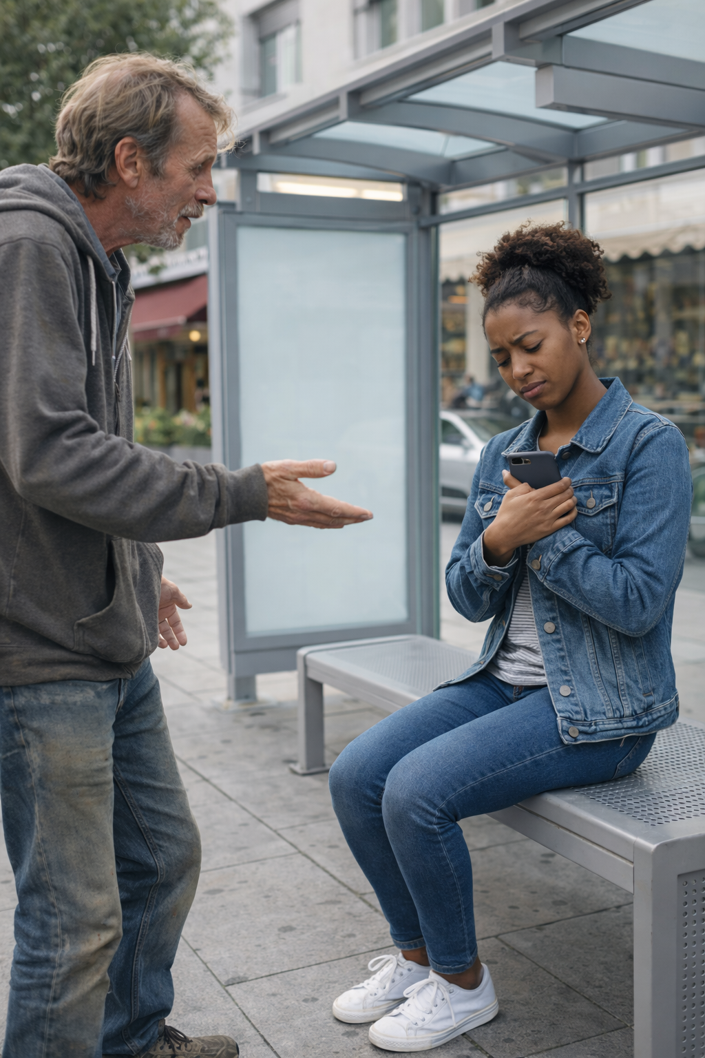 A businessman stood near the edge of the shelter, checking his watch every few seconds, clearly in a hurry. Not far from him, a teenage girl sat on the bench, her attention fixed entirely on her phone, scrolling without lifting her eyes.