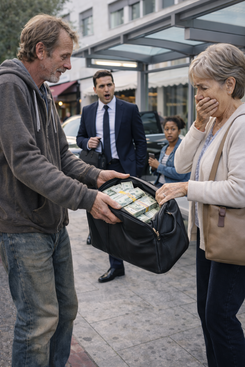 Behind her, the businessman and the girl stood frozen, watching everything unfold in silence. The same man they had refused moments earlier now stood in front of them, completely different from what they had assumed.