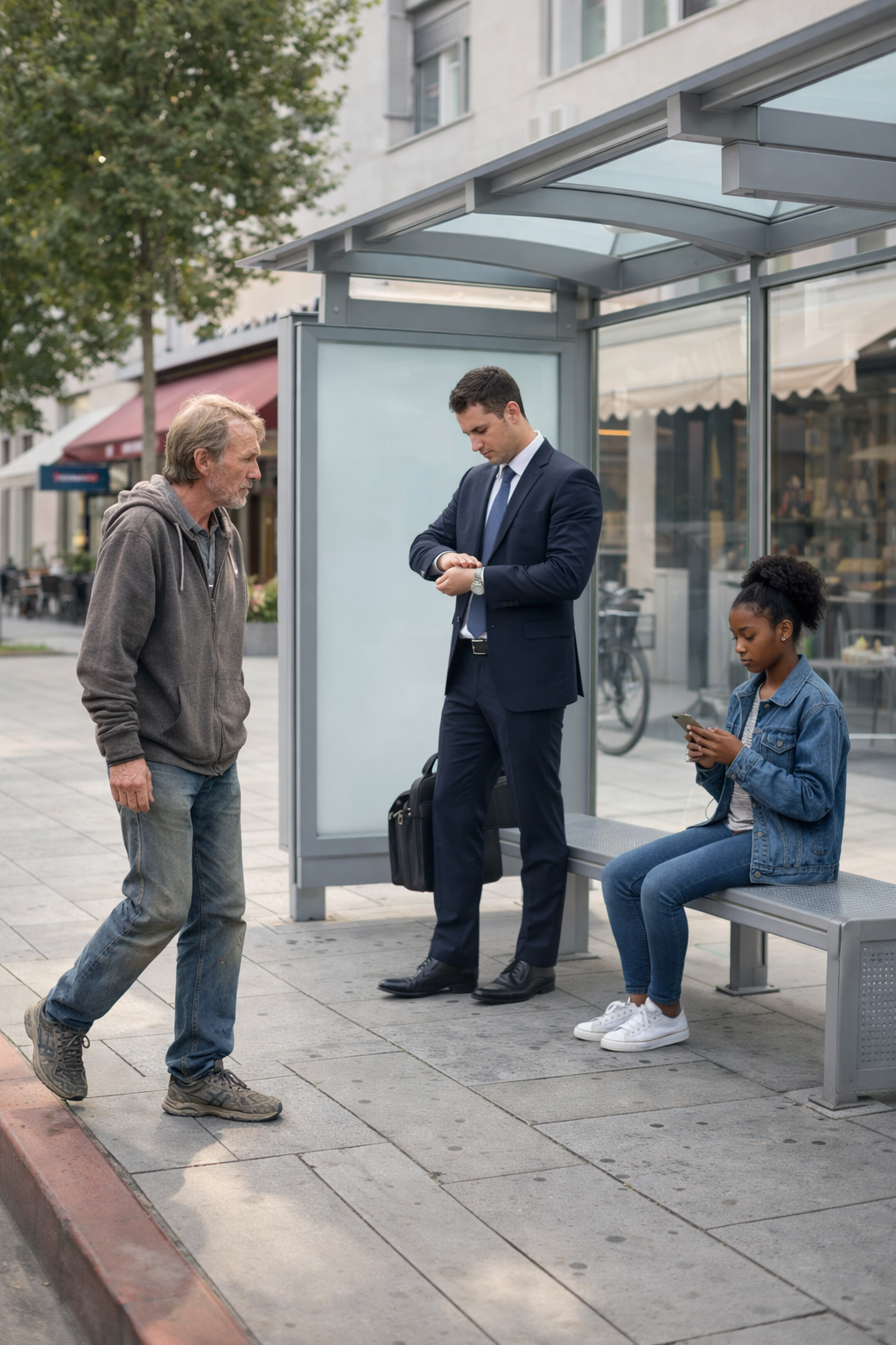 A businessman stood near the edge of the shelter, checking his watch every few seconds, clearly in a hurry. Not far from him, a teenage girl sat on the bench, her attention fixed entirely on her phone, scrolling without lifting her eyes.