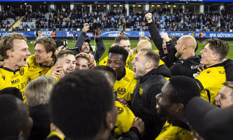 Tredje gången gilltNågra minuter efter cirkusnumret var det dessutom dags igen, när Tom Pettersson petade in 2–0 efter en hörna.Det var två kallduschar som IFK Göteborg inte orkade resa sig från, trots en forcering mot slutet av matchen.Mjällby hade chansen att säkra guldet redan innan landslagsuppehållet, när Hammarby mötte just IFK Göteborg men vann.Hammarby sköt sedan upp Mjällbys guldfest i ytterligare ett dygn genom att slå AIK i söndagens Stockholmsderby.Vid det laget satt Mjällbyspelarna redan på bussen från Hällevik, långt ute på blekingska Listerlandet.Ett dygn senare klev serieledarna ut på Gamla Ullevi, inför bland annat omkring 1 800 tillresta Mjällbysupportrar.2022 säkrade Häcken SM-guldet genom en 4–0-seger i derbyt på Gamla Ullevi och 2023 säkrade Malmö FF sitt SM-guld genom en hemmaseger mot “Blåvitt”.Den här gången var det Mjällbys tur att säkra guld i en match mot IFK Göteborg.