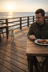 Soft waves brushed against the wooden docks while the sky slowly shifted into shades of gold and orange. At a small seaside café, a man sat alone at a rustic table, finishing a quiet dinner after a long day.