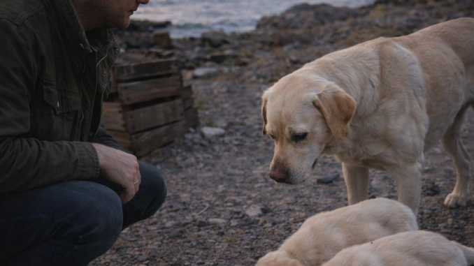 The next morning, the Labrador and his two puppies stood on fresh grass in front of a quiet farmhouse outside the city. The air smelled of earth and morning light. Open fields stretched toward distant hills.