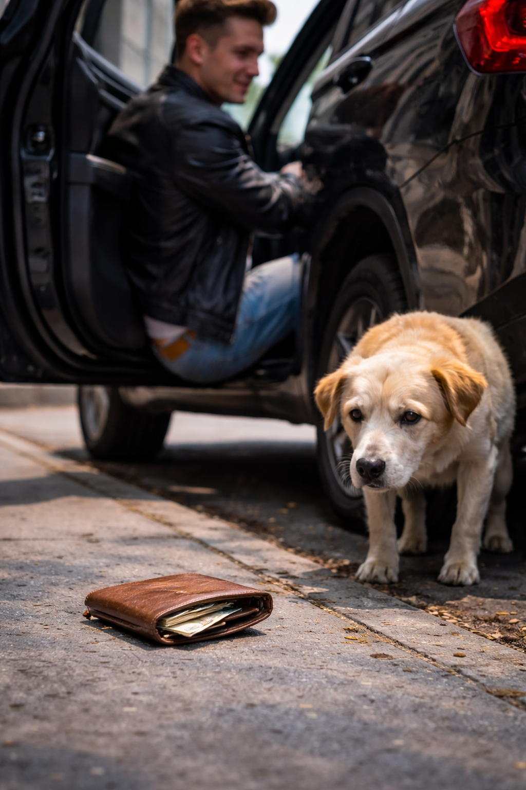 His wallet quietly fell onto the pavement behind the car.