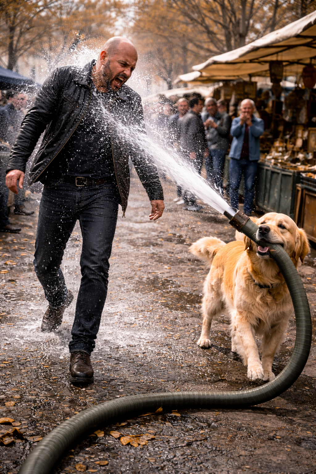 And in the middle of the market street stood the golden retriever, proudly holding the hose.
