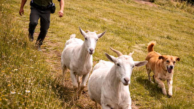 The dog ran alongside the goats, staying just behind them, keeping them moving forward instead of turning back in confusion.