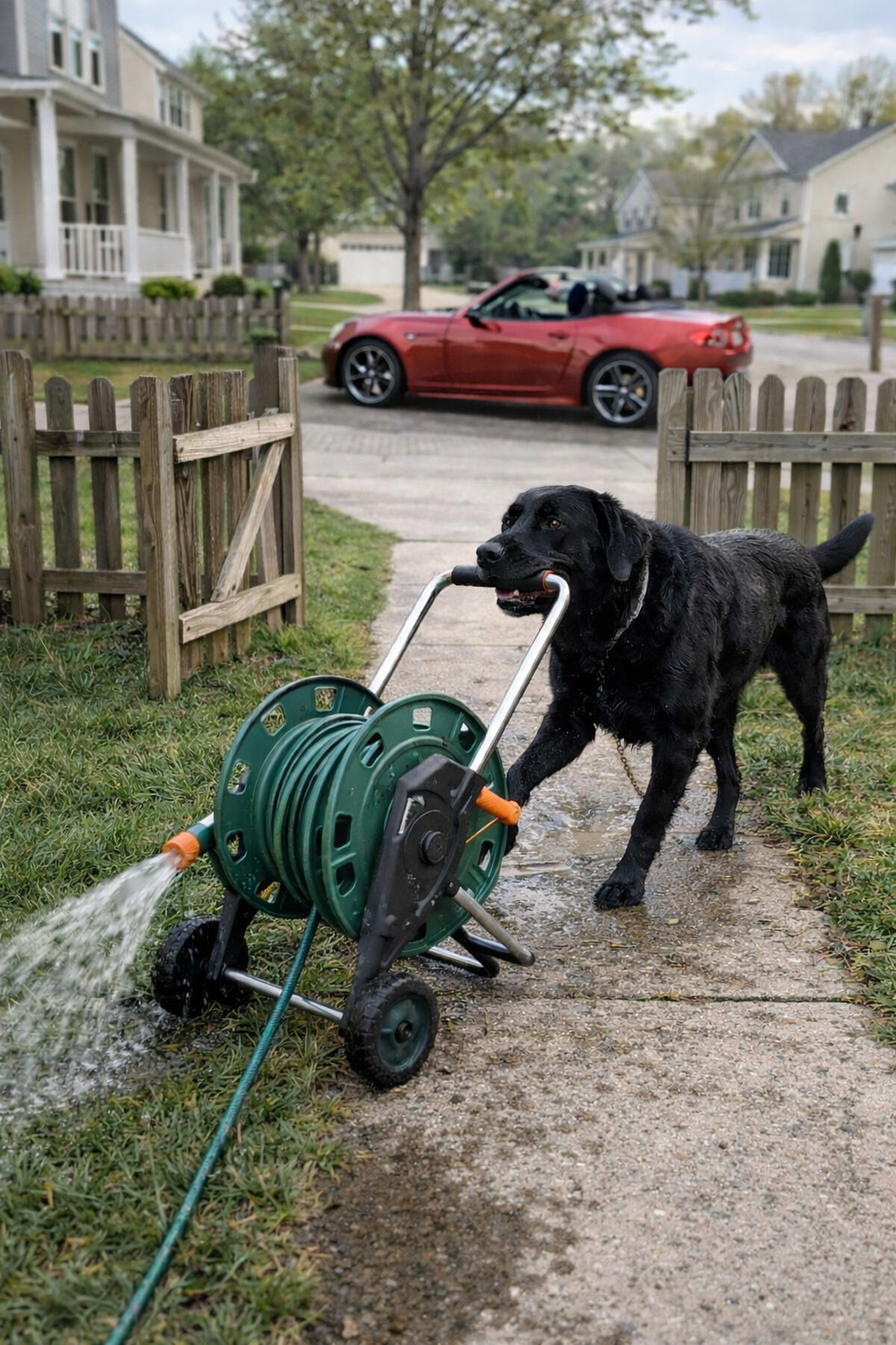 Nearby, the black Labrador proudly held the hose.