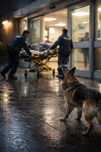 Paramedics moved quickly, guiding a weak middle-aged man on a stretcher inside. Behind them, a German Shepherd ran through the rain, paws splashing in shallow water. He barked once — sharp, urgent.