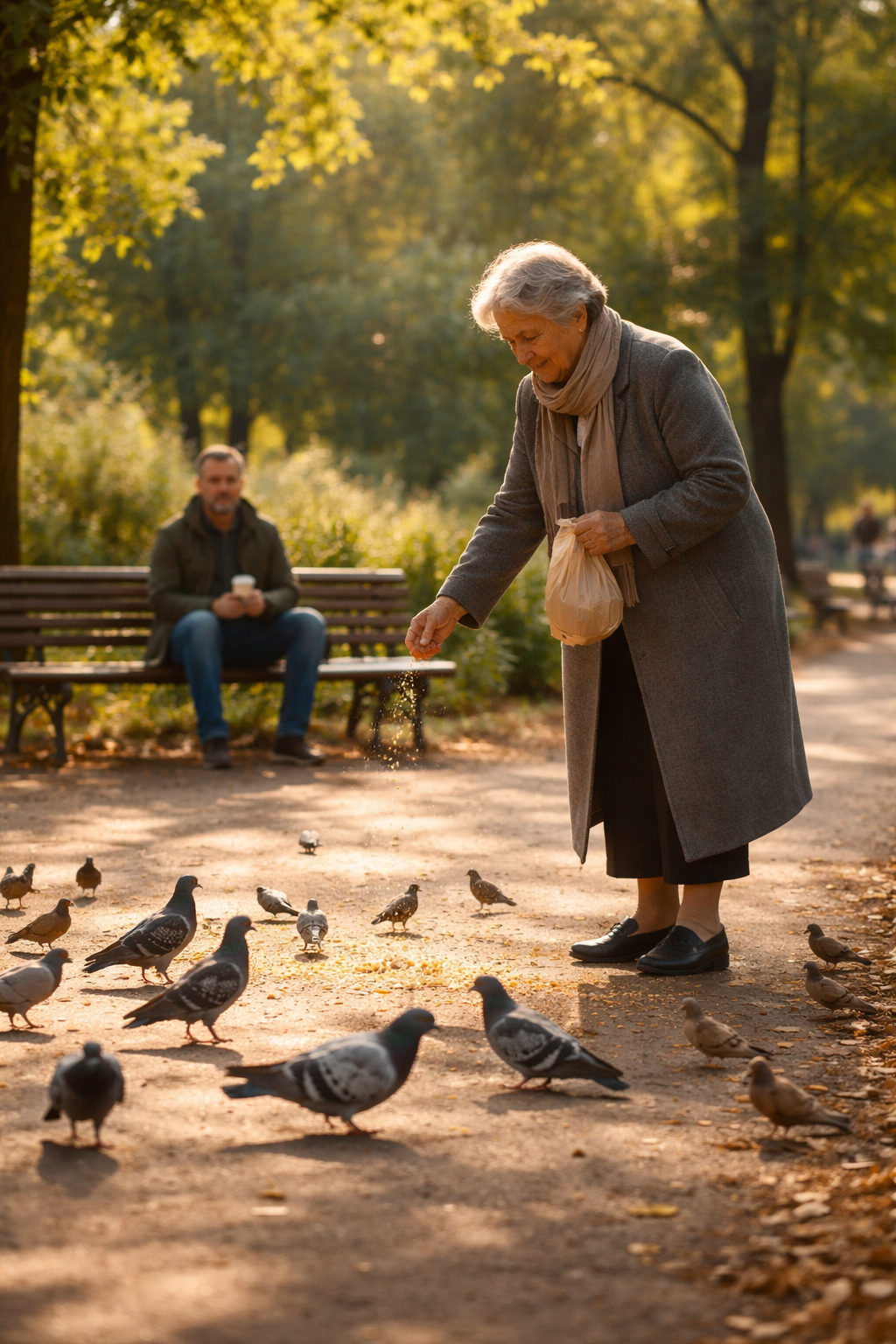 On a quiet morning in a peaceful city park, an elderly woman would arrive at the same time every day. Wrapped in a gray coat and a simple scarf, she moved slowly but with purpose, heading toward the same wooden bench as always.