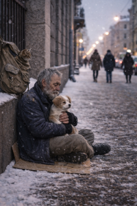 The man held the puppy closer to his chest, cupping it gently with both hands. His fingers were red from the cold, stiff and shaking, but he barely seemed to notice. The only thing that mattered was keeping the small animal warm.