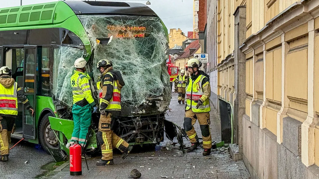 Kaos efter busskrocken – räddningstjänsten kämpar för att få loss chauffören!